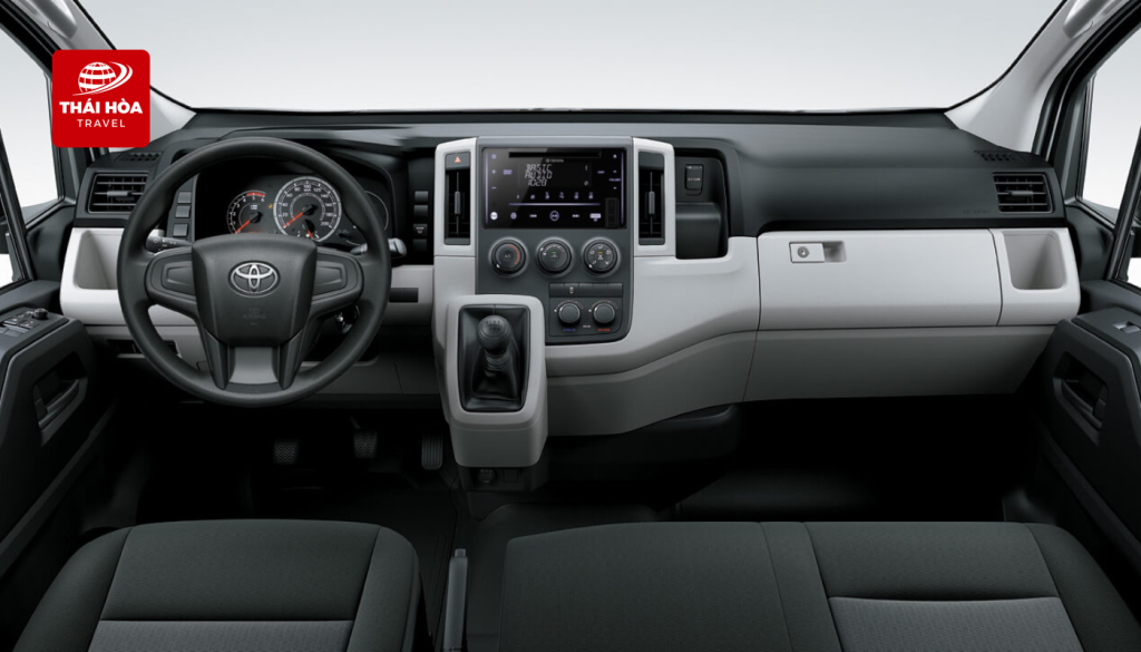Nội thất: Xe Toyota Hiace 16 chỗ được trang bị đầy đủ tiện nghi cơ bản, mang lại trải nghiệm dễ chịu cho hành khách: