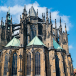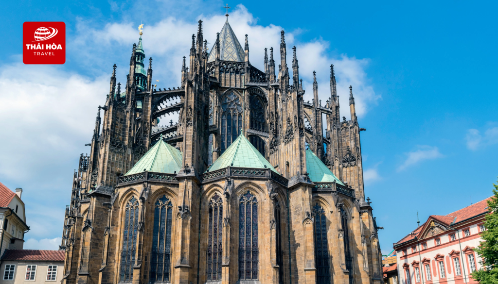 - Nhà thờ St. Vitus: Công trình gây ấn tượng với kiến trúc Gothic, nổi bật bởi hai tháp chuông cao vút, hệ thống cửa sổ vòm nhọn cùng những chi tiết điêu khắc tinh xảo. Phía mặt nam có Cổng Vàng (Golden Gate) được trang trí bằng bức tranh khảm về ngày Phán xét cuối cùng.