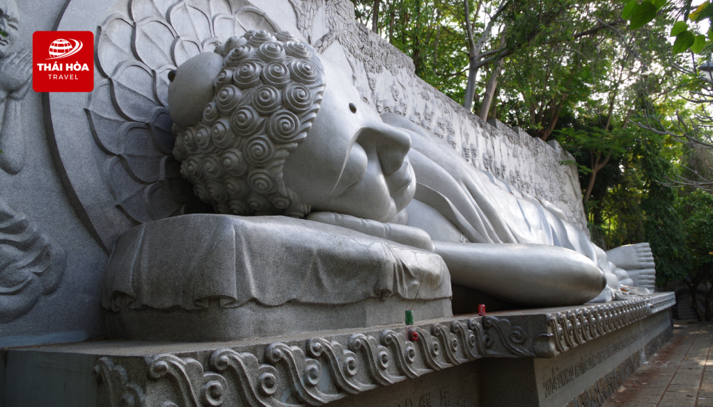 - Chùa Long Sơn: Nổi bật với tượng Kim Thân Phật Tổ màu trắng cao khoảng 24m, tọa lạc trên đỉnh đồi. Khi chinh phục khoảng 44 bậc thang lên đỉnh, quý khách sẽ được chiêm ngưỡng tượng Phật Tổ nhập Niết Bàn dài 17m, chế tác từ đá hoa cương.