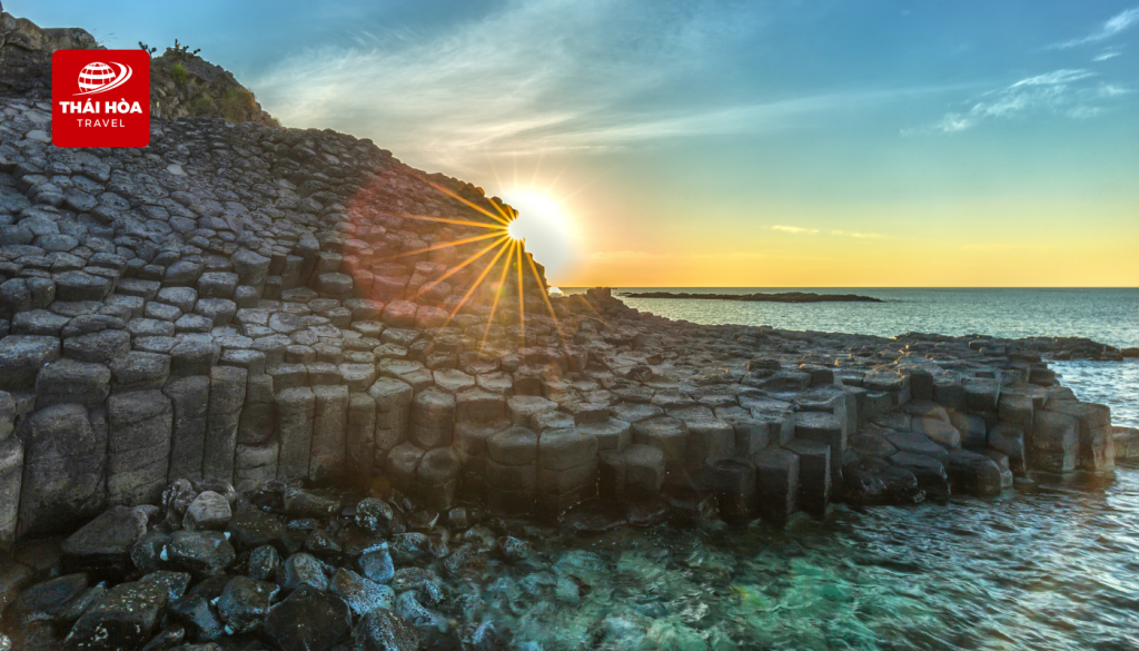 - Gành Đá Dĩa (Ghềnh Đá Đĩa): Nhìn từ xa, Gành Đá Dĩa trông như một tổ ong khổng lồ hoặc những chồng đĩa đá xếp lớp vươn mình ra biển. Nơi đây sở hữu khoảng 35.000 khối đá với hình dạng đa dạng như lục giác, vuông, tròn. Tùy theo thời điểm trong ngày, màu đá có thể chuyển đổi linh hoạt, lúc đen huyền bí, lúc lại ánh lên sắc xanh xám hòa cùng màu biển.