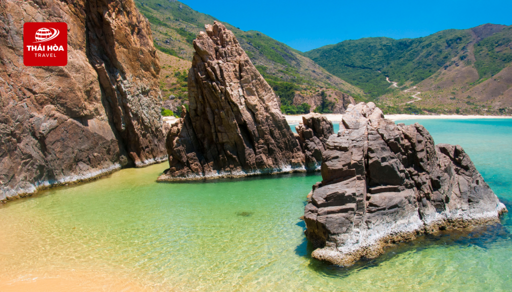 - Bãi biển Kỳ Co: Bãi biển gây ấn tượng bởi làn nước biển chuyển màu rõ rệt theo từng lớp. Khu vực gần bờ mang sắc xanh ngọc bích trong veo, có thể nhìn thấy tận đáy cát trắng, trong khi phía xa lại là màu xanh dương đậm đặc trưng của đại dương. Khi thủy triều rút, các vách đá xung quanh dần lộ ra những hang nhỏ cùng các “hồ bơi tự nhiên” được tạo thành từ những phiến đá chắn sóng. Nước trong các hồ này khá êm và ít sóng, rất phù hợp cho trẻ em vui chơi an toàn.