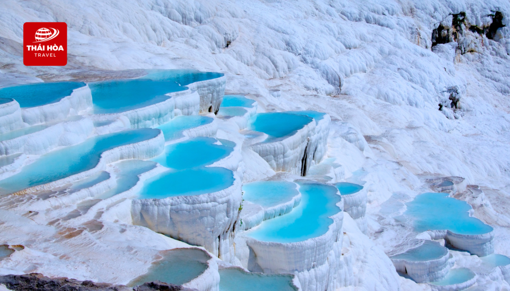 • Chiều: Khởi hành đến Pamukkale – Kỳ quan thiên nhiên độc đáo của Thổ Nhĩ Kỳ, nổi bật với những tầng đá vôi trắng hình thành từ nguồn suối khoáng nóng qua hàng nghìn năm.
