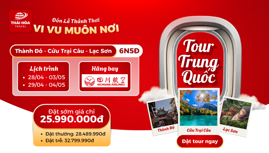 Tour Trung Quốc 6N5Đ của Thái Hòa Travel sẽ đưa bạn khám phá Tứ Xuyên kỳ vĩ: Check-in Cửu Trại Câu – thiên đường hạ giới, ghé thăm Công viên Gấu Trúc, dạo bước Thành Đô và chiêm bái Lạc Sơn Đại Phật linh thiêng.
